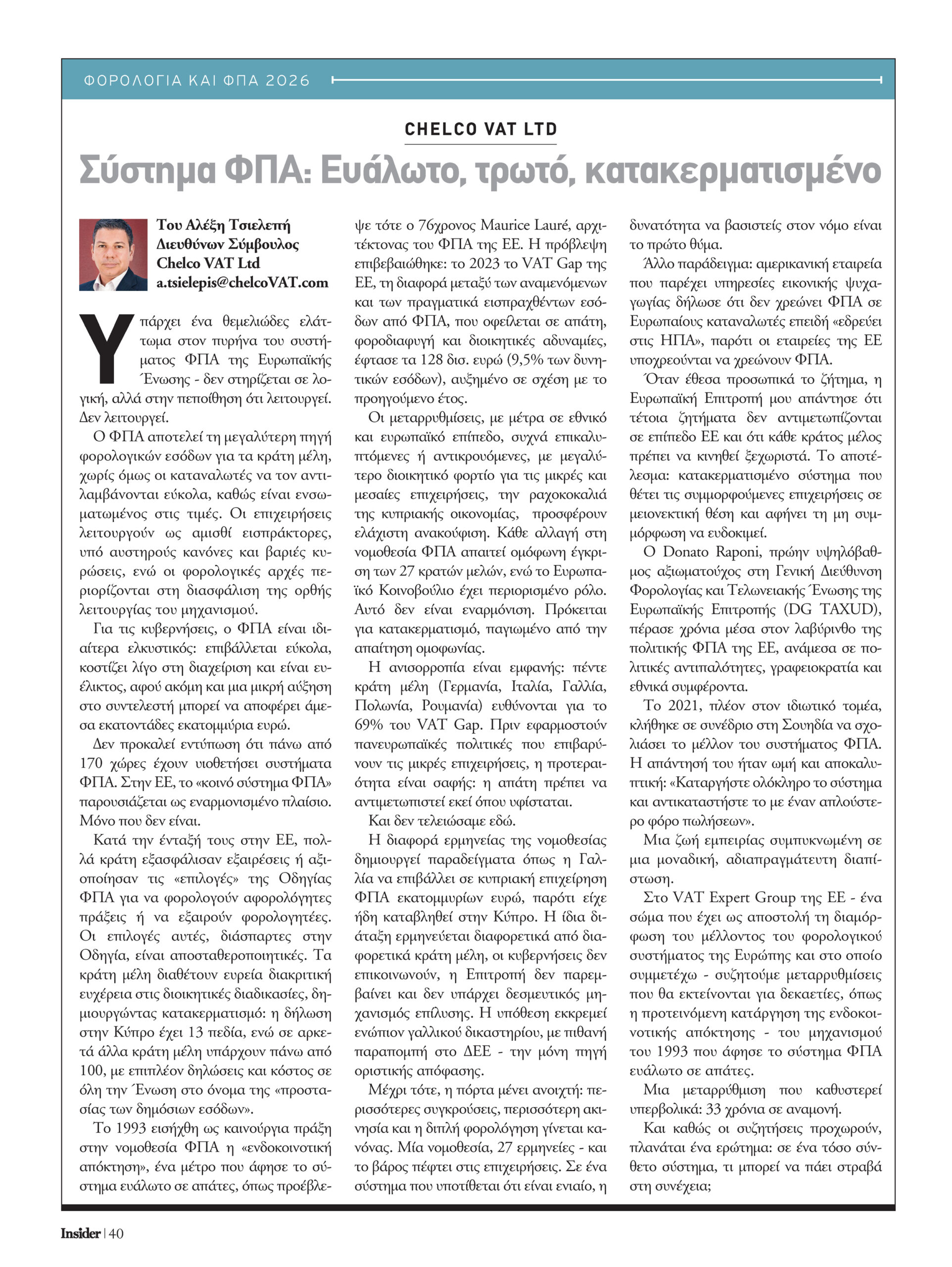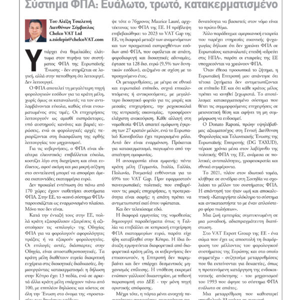 Ο Διευθύνων Σύμβουλος της Chelco VAT και κορυφαίος ειδικός σε θέματα ΦΠΑ, Αλέξης Τσιελεπής, σε άρθρο του στο περιοδικό Insider του Φιλελευθέρου κατακεραυνώνει το Ευρωπαϊκό σύστημα ΦΠΑ και ζητά τη ριζική αναμόρφωσή του.